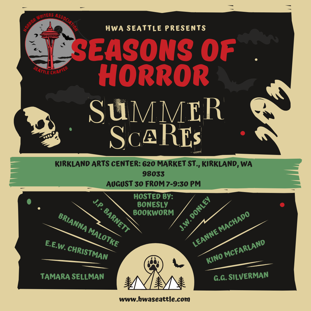 I will be reading LIVE a new short story at Summer Scares at the Kirkland Arts Center this Saturday, August 30! It’s free! Come on by and listen to other Seattle area horror writers read some spooky stuff!